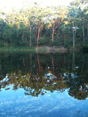 やがてじわじわと陽が昇り、光が増えてきて、ふと池に目を落とせば水鏡。